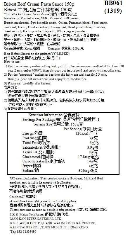 [EXP:2026.4.1]Bebest 牛肉忌廉白汁拌醬料 150克(適合10個月以上)_BB061_S