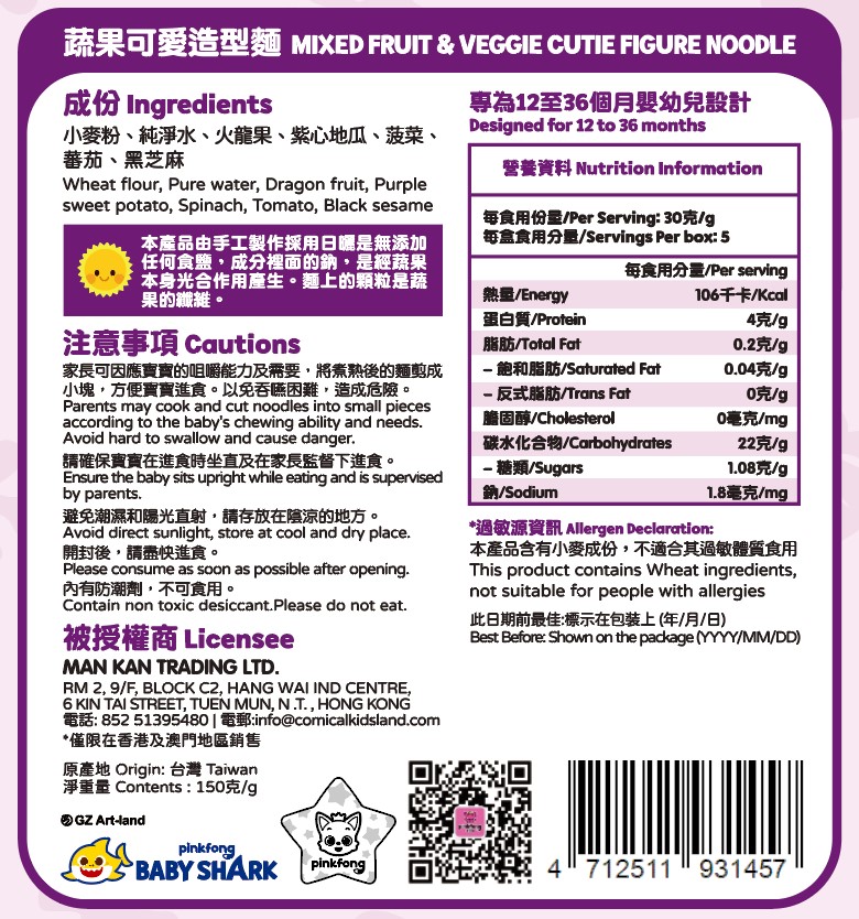 鯊魚寶寶麵 (蔬果可愛造型麵) 150g_TW139