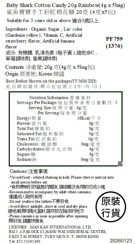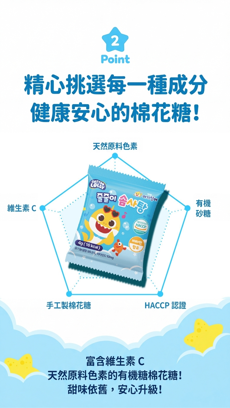 -Pinkfong & Baby Shark 是寶寶最喜愛的卡通品牌. -產品造型可愛,吸引寶寶的學習、繪畫和進食的興趣. -100% 有機甘蔗的健康零食. -它是一種未精製的糖,可以緩慢地為我們的身體提供糖分. -特別添加維他命 C,富含營養和微妙的甜味! -HACCP 認證的純手工棉花糖,吃得放心. -香蕉、草莓口味的彩虹棉花糖. 此產品: -建議適合 3 歲以上 -淨重量:20克 (4克 x 5包) 韓國製造