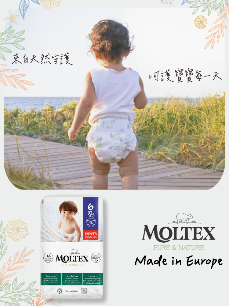 給寶寶最天然的守護 Moltex 歐洲頂級純天然透氣學習褲專為嬰幼兒脆弱肌膚設計,讓每一次貼合都舒適自在。 -3款不同尺寸,滿足各階段寶寶需求 -高透氣不織布,保持乾爽不悶熱 ,減少尿布疹風險 -360° 舒適彈性腰圍,自由伸縮,方便活動,更容易更換 -專利SecondDry技術,獨特瞬吸系統,快速鎖水 -持續12小時吸濕,夜晚安心不打擾 -100% 無添加香料 & 化學漂白 -環保材質,守護地球同時守護寶寶 -歐洲製造,歐洲品質保證 -通過國際過敏認證及歐盟皮膚權威機構 5星敏感測試認証 給寶寶最安心的呵護,從選擇開始! 選擇 MOLTEX,天然安心,讓寶寶自在成長,爸媽更放心!