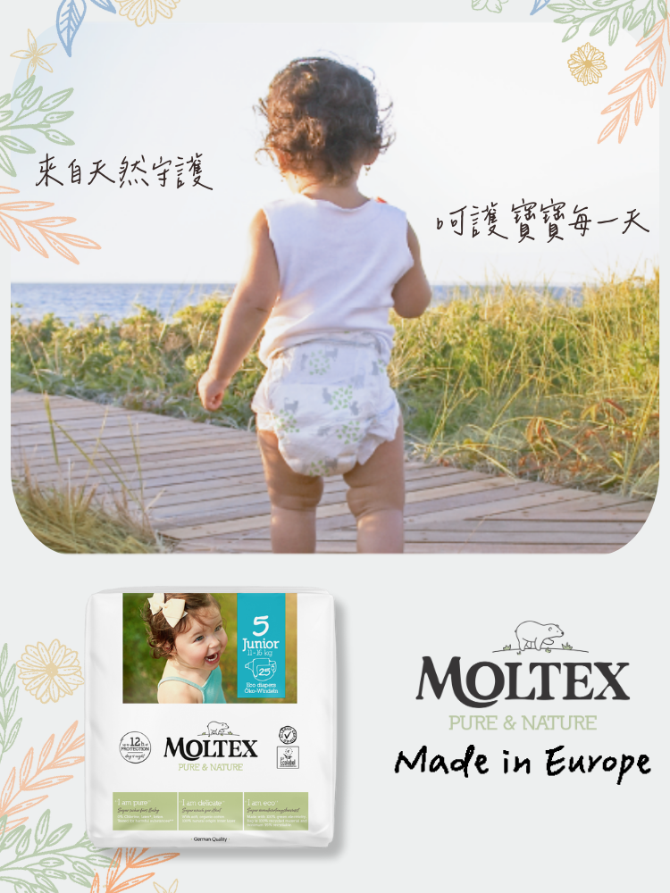給寶寶最天然的守護 Moltex 歐洲頂級純天然透氣紙尿片專為嬰幼兒脆弱肌膚設計,讓每一次貼合都舒適自在。 -6款不同尺寸,涵蓋新生兒到活潑寶寶,成長每一步都有合適的守護 -高透氣不織布,保持乾爽不悶熱 ,減少尿布疹風險 -柔緻腰圍不勒肚,活動更自在 -專利SecondDry技術,獨特瞬吸系統,快速鎖水 - 持續12小時吸濕,夜晚安心不打擾 - 100% 無添加香料 & 化學漂白 - 環保材質,守護地球同時守護寶寶 -歐洲製造,歐洲品質保證 -通過國際過敏認證及歐盟皮膚權威機構 5星敏感測試認証 給寶寶最安心的呵護,從選擇開始! 選擇 MOLTEX,天然安心,讓寶寶自在成長,爸媽更放心!