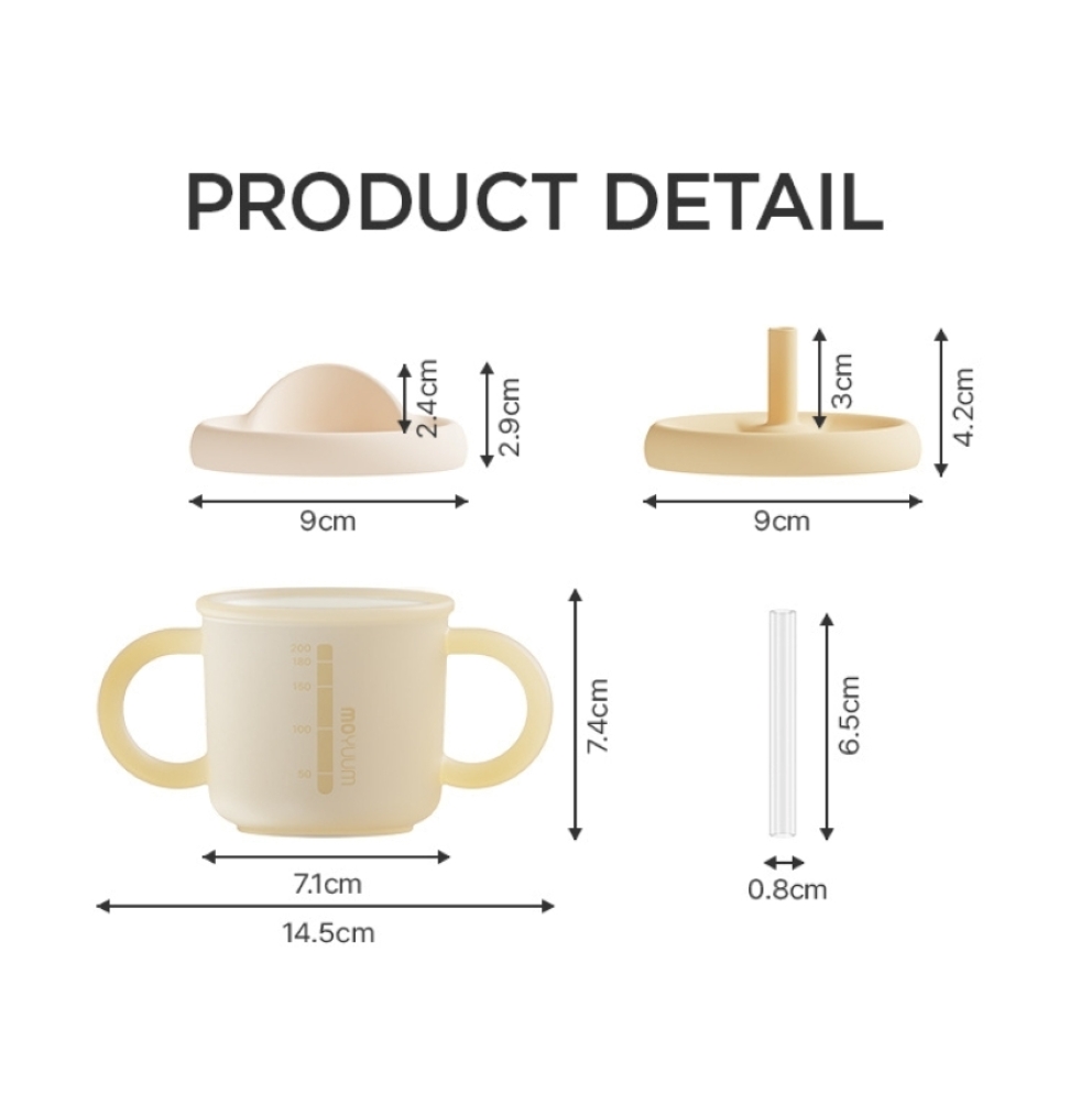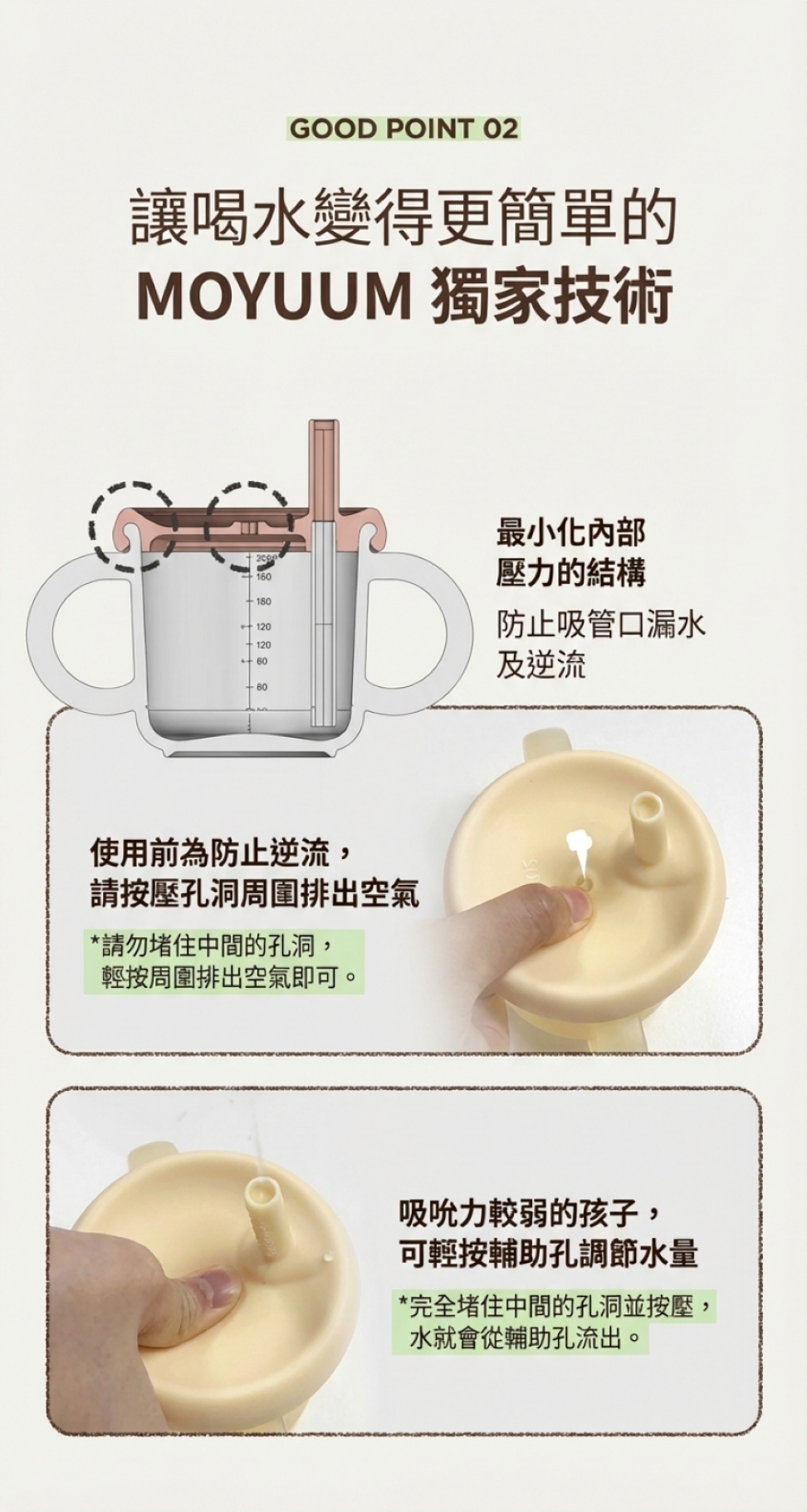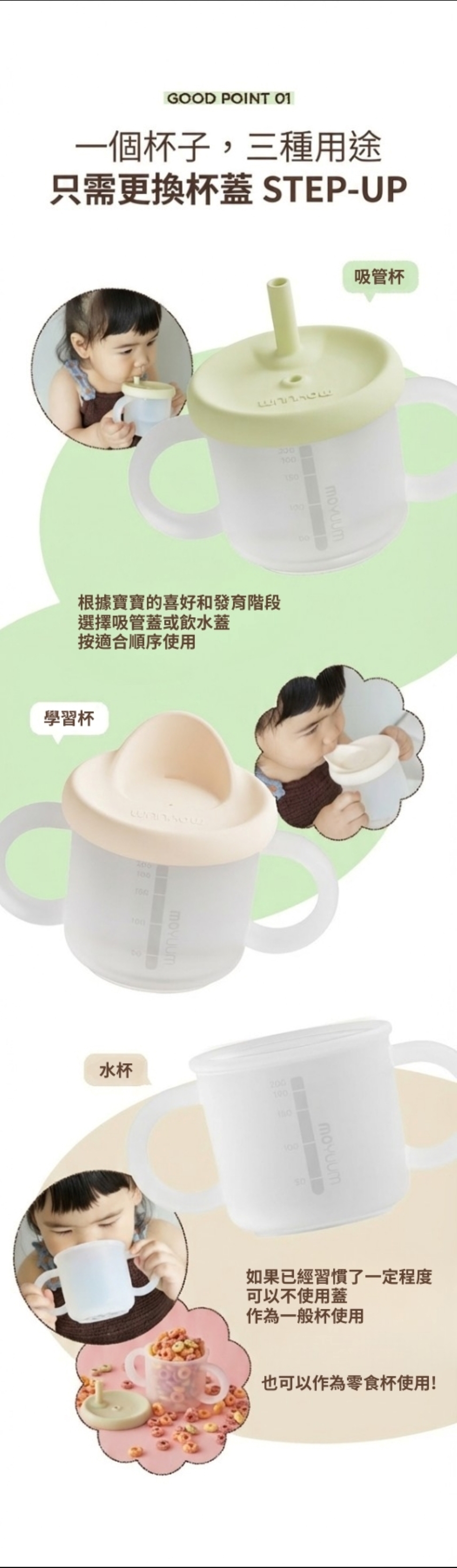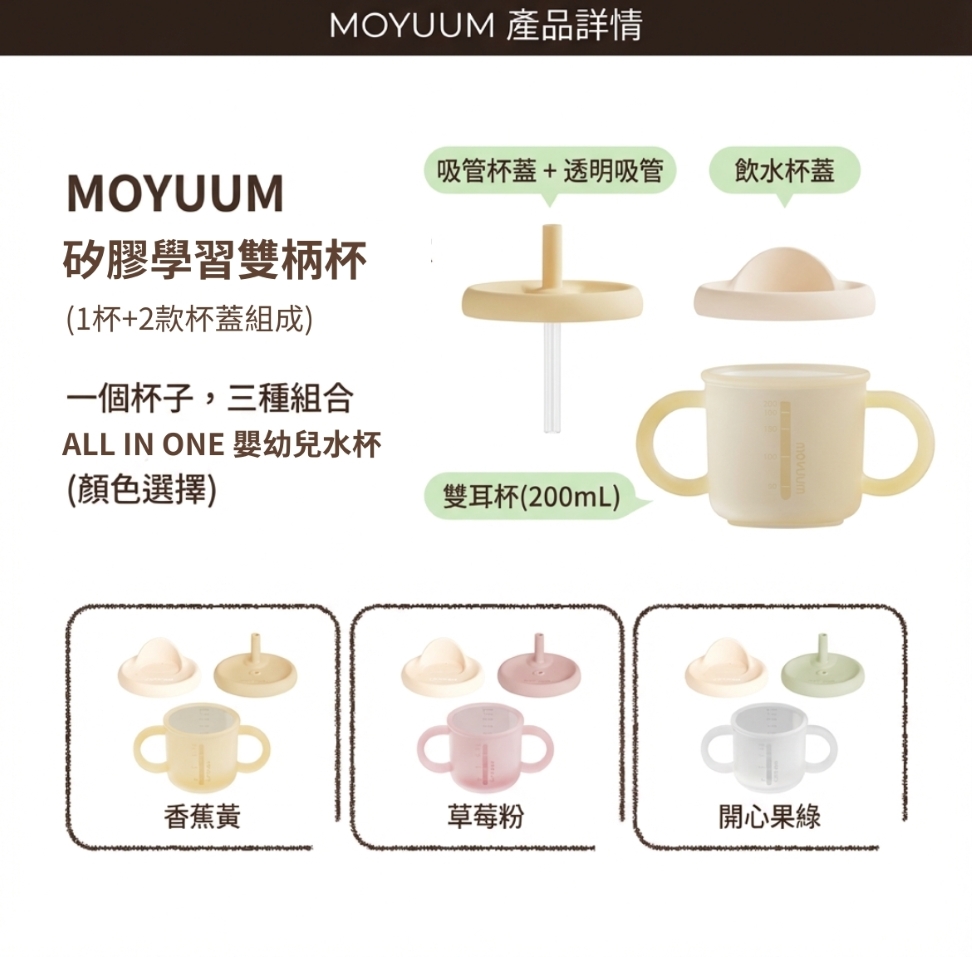 Moyuum 矽膠學習雙柄杯 200ml 陪伴寶寶從 6 個月開始的安心選擇 一杯三用:吸管杯、飲水杯、零食杯,靈活滿足不同需求 防漏設計:吸管杯蓋與杯口緊密貼合,外出也不怕灑漏 容量標示+半透明杯身:輕鬆掌握寶寶每日飲水量 矽膠材質:耐用抗摔,爸媽更放心 簡約設計:清洗方便,日常使用更省心 雙柄設計:寶寶小手也能輕鬆拿握,訓練自主飲水 一杯多用,安全耐用,讓寶寶飲得開心、爸媽用得安心