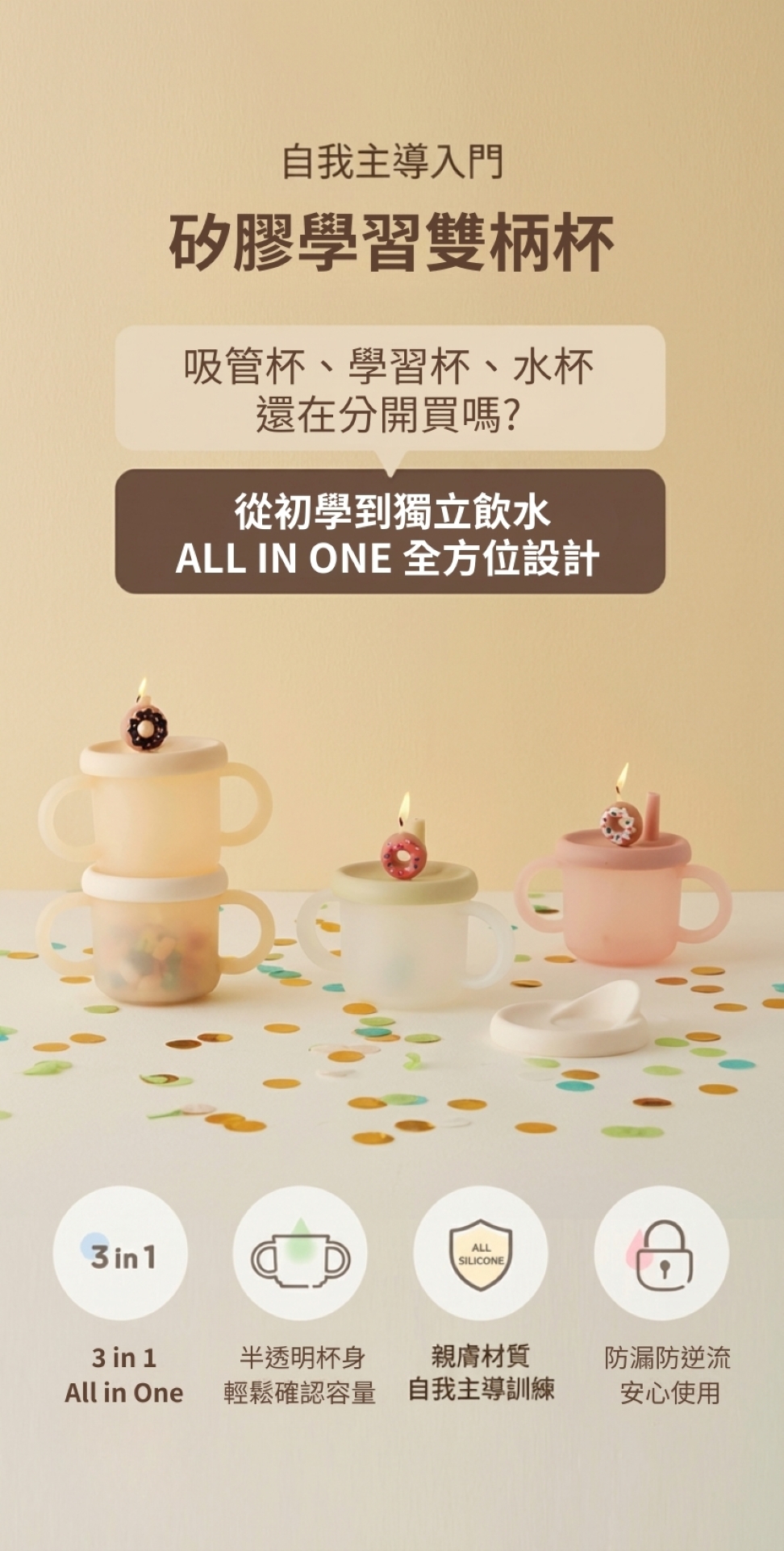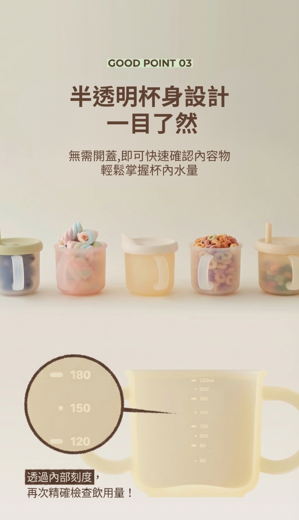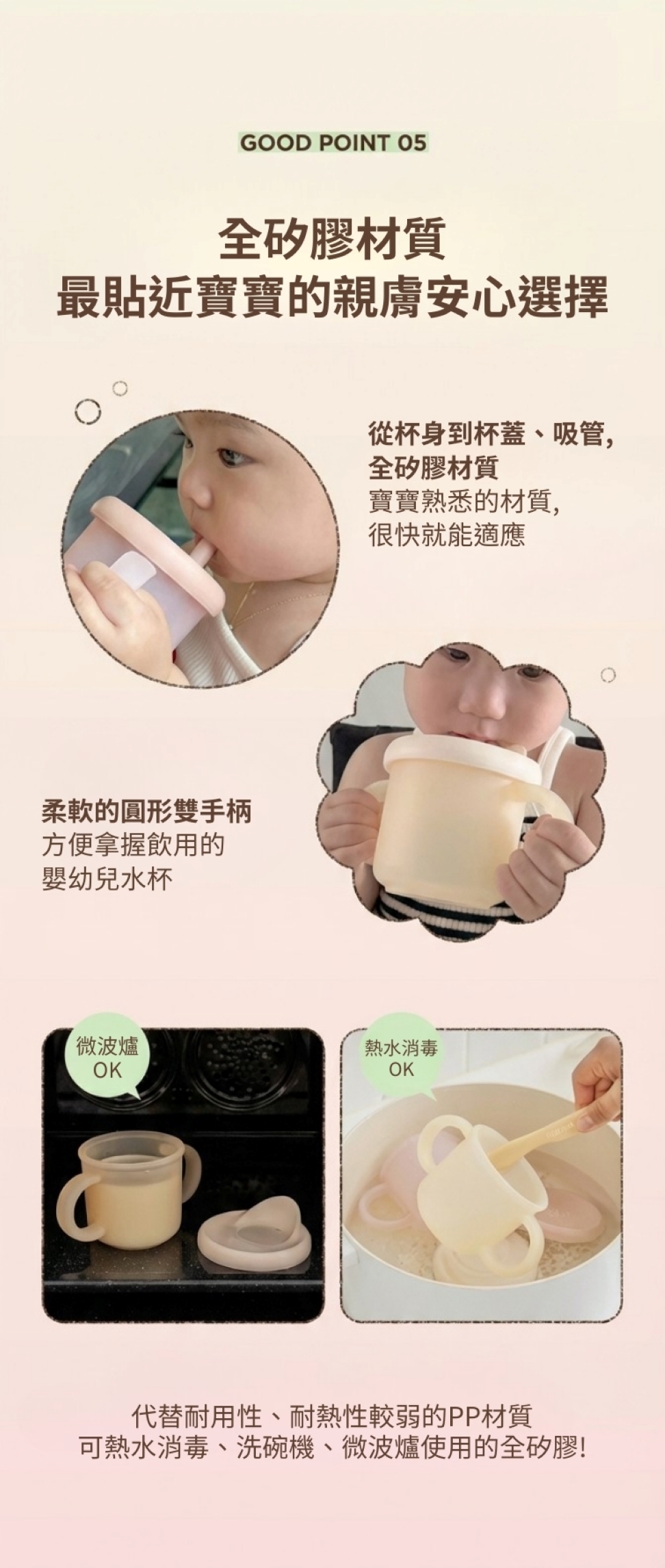 Moyuum 矽膠學習雙柄杯 200ml 陪伴寶寶從 6 個月開始的安心選擇 一杯三用:吸管杯、飲水杯、零食杯,靈活滿足不同需求 防漏設計:吸管杯蓋與杯口緊密貼合,外出也不怕灑漏 容量標示+半透明杯身:輕鬆掌握寶寶每日飲水量 矽膠材質:耐用抗摔,爸媽更放心 簡約設計:清洗方便,日常使用更省心 雙柄設計:寶寶小手也能輕鬆拿握,訓練自主飲水 一杯多用,安全耐用,讓寶寶飲得開心、爸媽用得安心