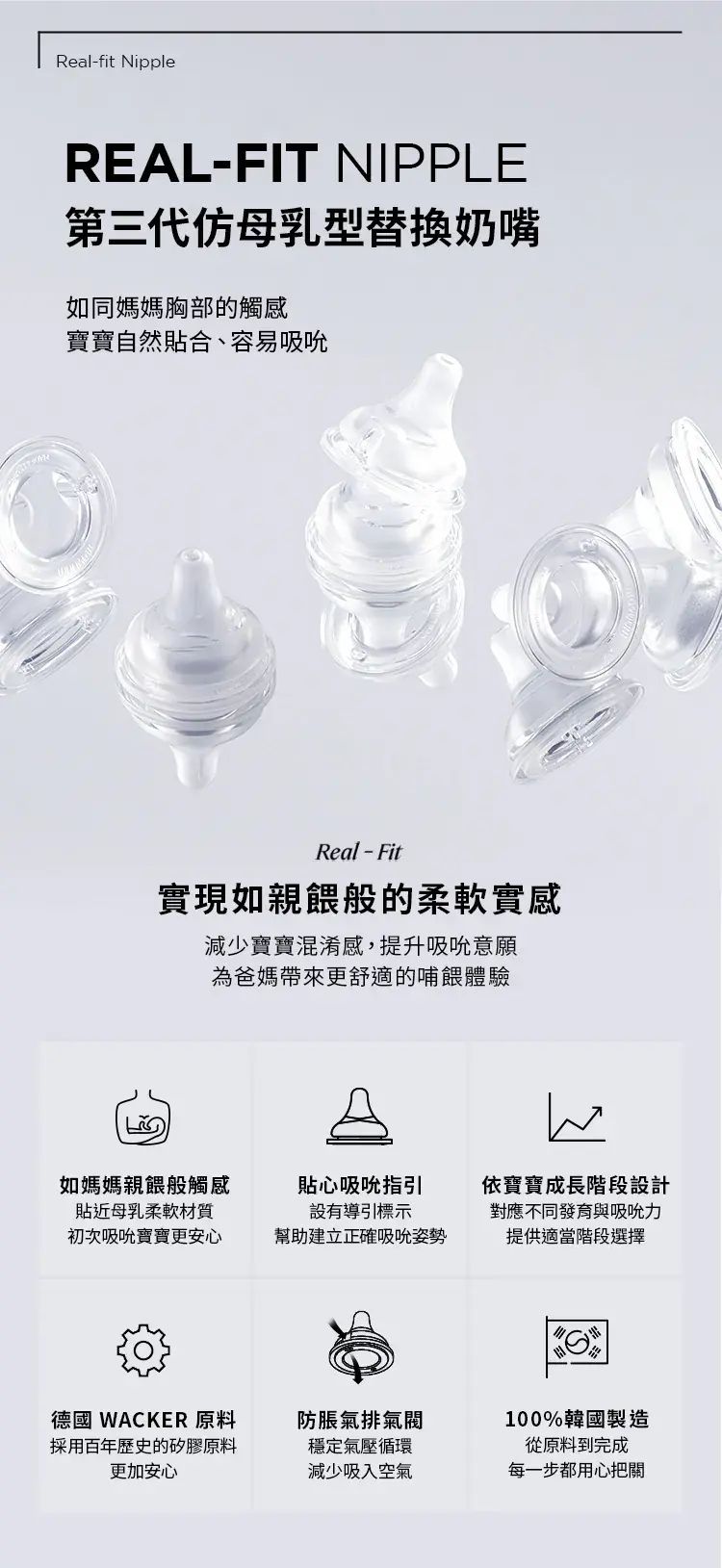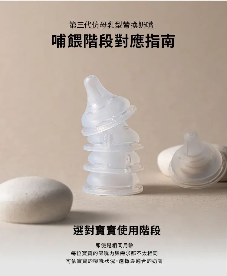 - 防漲氣仿母乳奶嘴(第一階段 0-1m+): 食品級矽膠 (耐熱性:0~120℃)