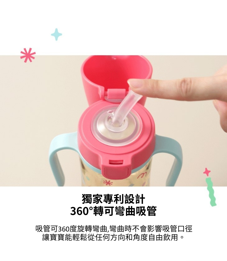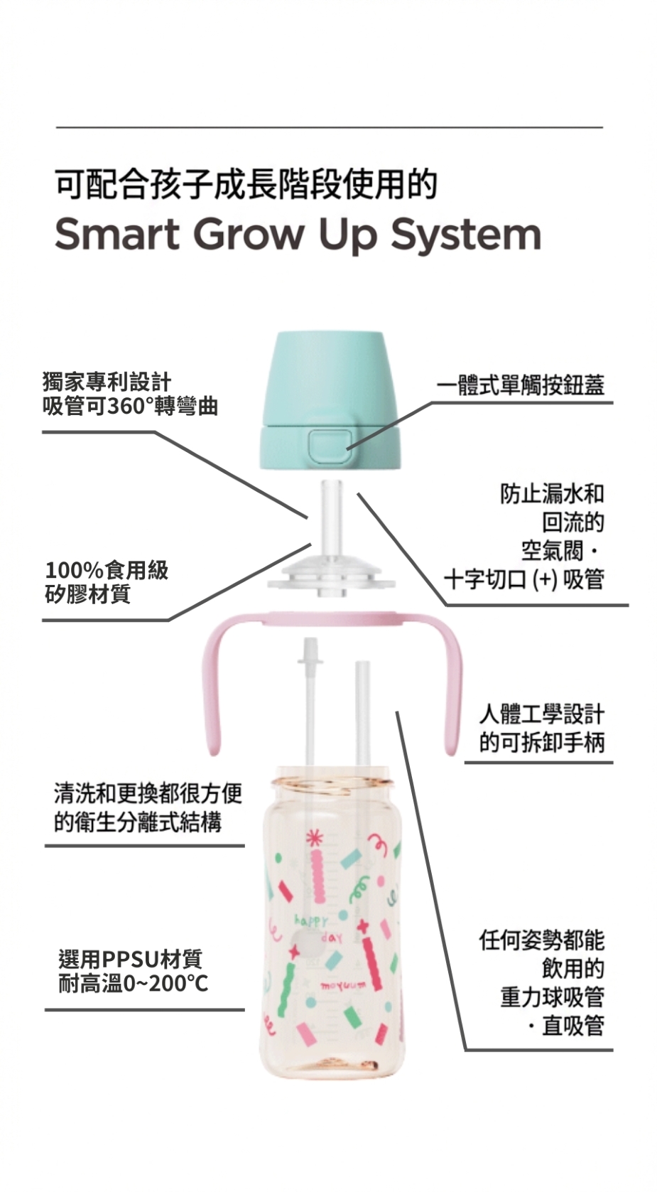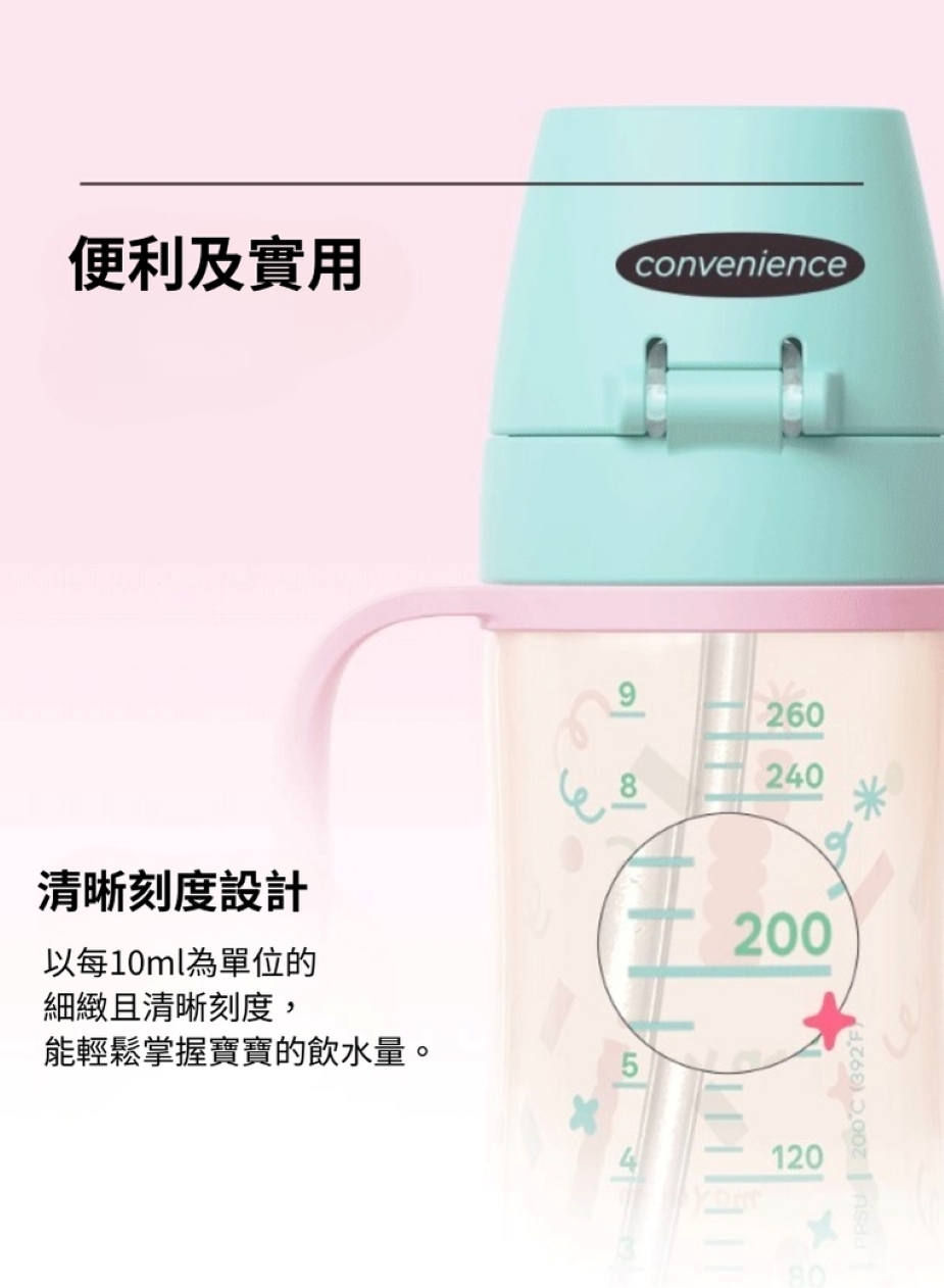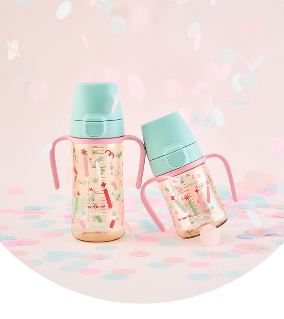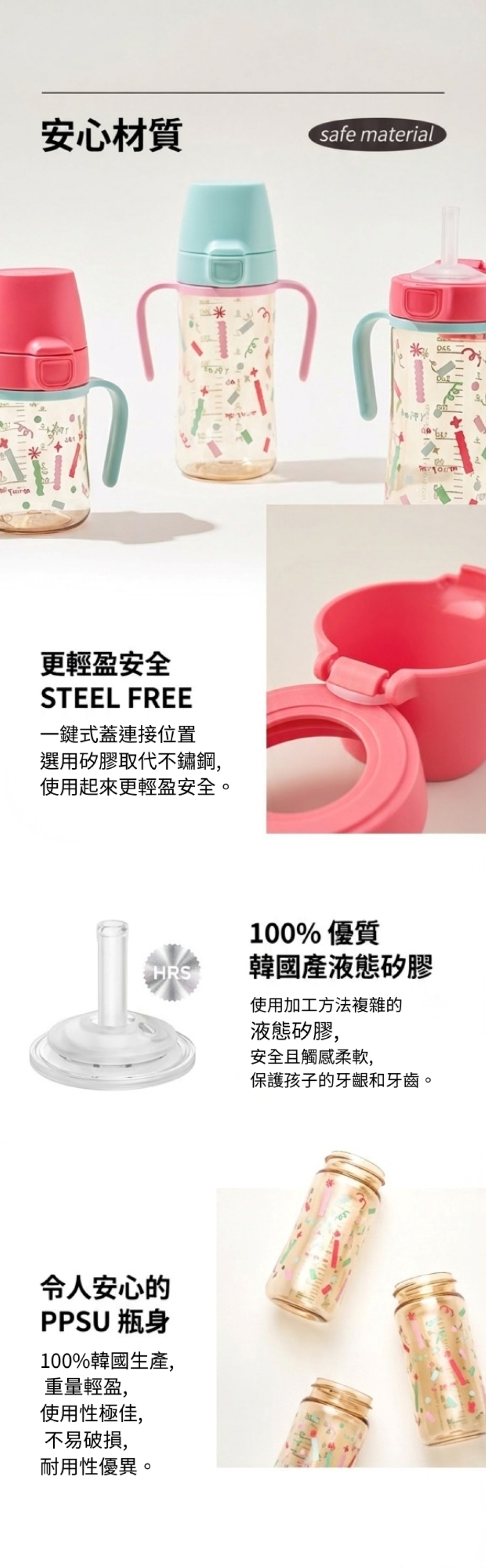 -Happy Day Edition 聖誕派對造型 -190度 廣角開蓋,寶寶輕鬆飲用 -天然黃金色,不含任何人工色素 -不含雙酚A -煮沸消毒至200度,可冷凍冷藏耐低溫 -獨家專利設計,可360度旋轉飲水方向防漏設計 -寬型排氣閥,具紓氣結構令飲奶更順暢 -寬口徑瓶口,清洗更方便,瓶底圓角設計, 無氣味, 不粘膩, 不吸油 -質地強韌, 耐用抗摔 -人體工學設計,讓寶寶練習抓握奶瓶 -符合歐盟 EN 14350:2020 -符合美國FDA食品級標準材質及CPSIA認證 材質: - 寬口奶瓶: PPSU (0~200℃) - 彈蓋:聚丙烯 ,矽膠(0~100℃) -十字型吸管轉接頭及直飲式吸管 : 矽膠 (0~250℃) - 手把 : 聚丙烯(0~100℃) 韓國製造