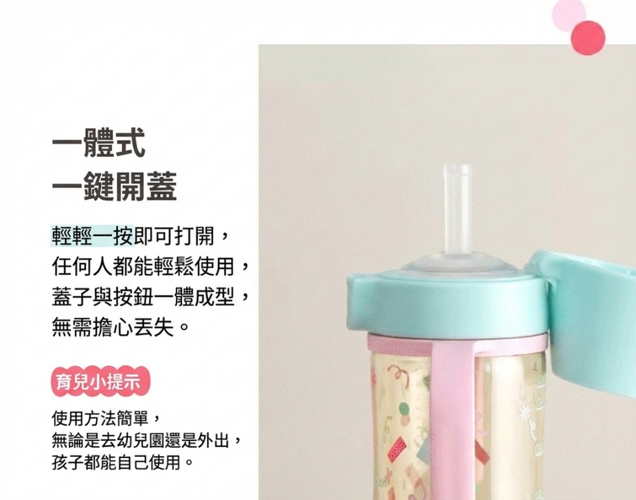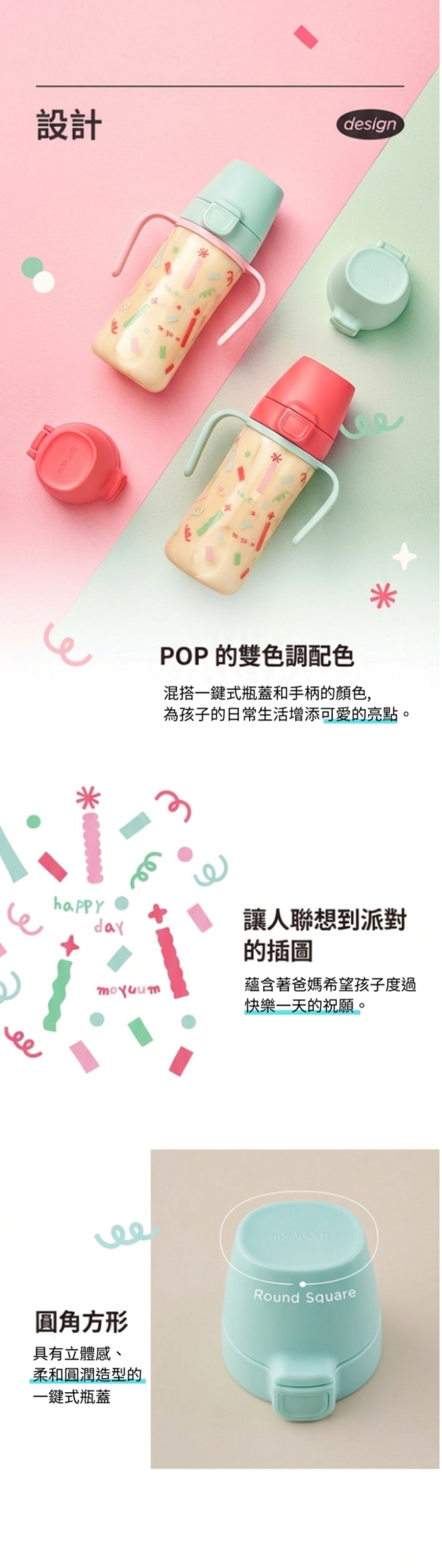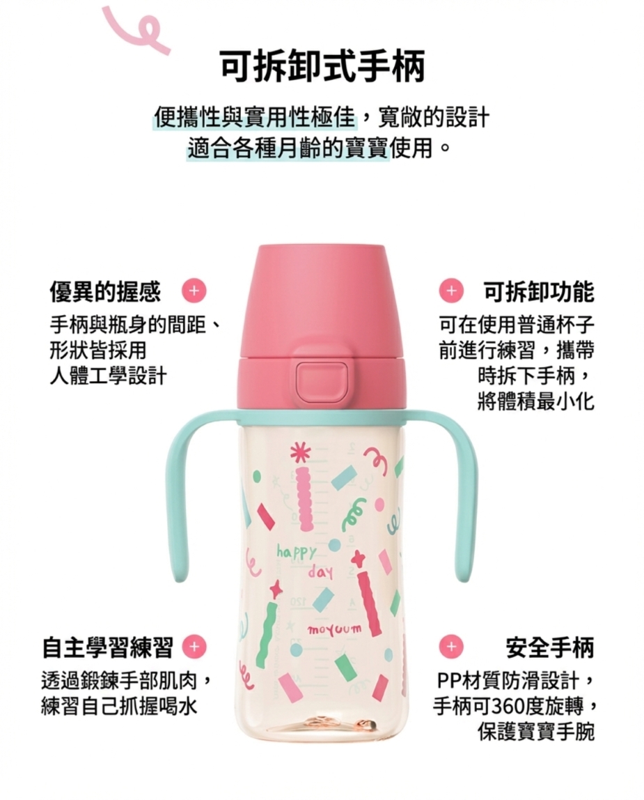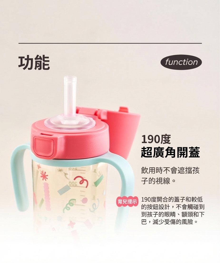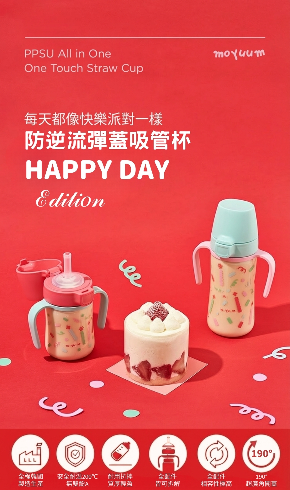 -Happy Day Edition 聖誕派對造型 -190度 廣角開蓋,寶寶輕鬆飲用 -天然黃金色,不含任何人工色素 -不含雙酚A -煮沸消毒至200度,可冷凍冷藏耐低溫 -獨家專利設計,可360度旋轉飲水方向防漏設計 -寬型排氣閥,具紓氣結構令飲奶更順暢 -寬口徑瓶口,清洗更方便,瓶底圓角設計, 無氣味, 不粘膩, 不吸油 -質地強韌, 耐用抗摔 -人體工學設計,讓寶寶練習抓握奶瓶 -符合歐盟 EN 14350:2020 -符合美國FDA食品級標準材質及CPSIA認證 材質: - 寬口奶瓶: PPSU (0~200℃) - 彈蓋:聚丙烯 ,矽膠(0~100℃) -十字型吸管轉接頭及直飲式吸管 : 矽膠 (0~250℃) - 手把 : 聚丙烯(0~100℃) 韓國製造