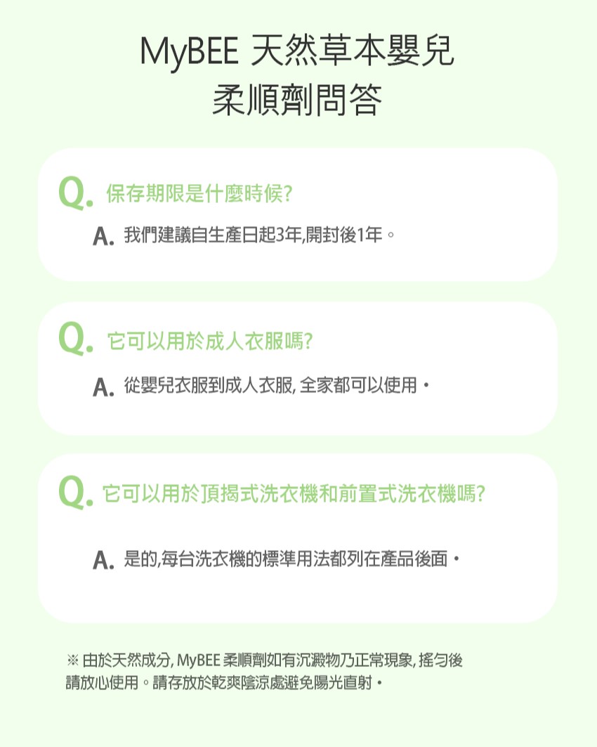 -適合嬰兒及敏感皮膚 -選用天然植物萃取物提煉,添加溫和配方,安全可靠,衣物柔順清香 -通過歐洲皮膚測試 Dermatest, PH 7.5中性酸鹼度不致敏,保護嬰兒脆弱的肌膚 -含橄欖萃取物及多種草本精華,香味能長時間持續 -98%可被生物降解,易於沖洗,不會殘留於衣物上,減少對肌膚的刺激 -提升衣物柔軟效果,減少靜電粘附 -不含甲醛,螢光漂白劑,苯氧乙醇,磷酸鹽及Paraben等有害物 -有效除嘔奶及除臭味,抗菌達99%