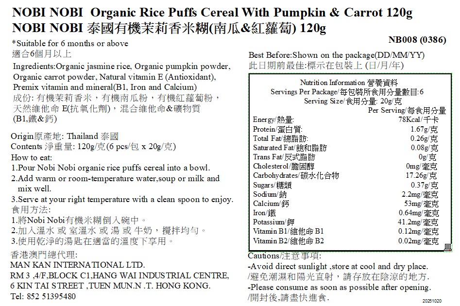 NOBI NOBI 泰國有機茉莉香米糊(南瓜&紅蘿蔔) 120g(適合6個月以上)#含維生素_NB008