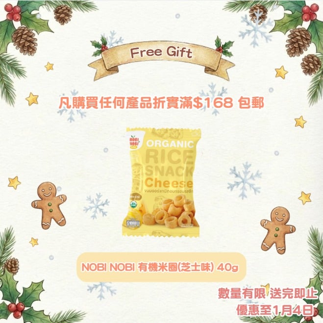 即日起至 1月4日,凡購買折實滿 $168,即可免費獲贈NOBI NOBI 有機米圈(芝士味) 40g 及 免運費
