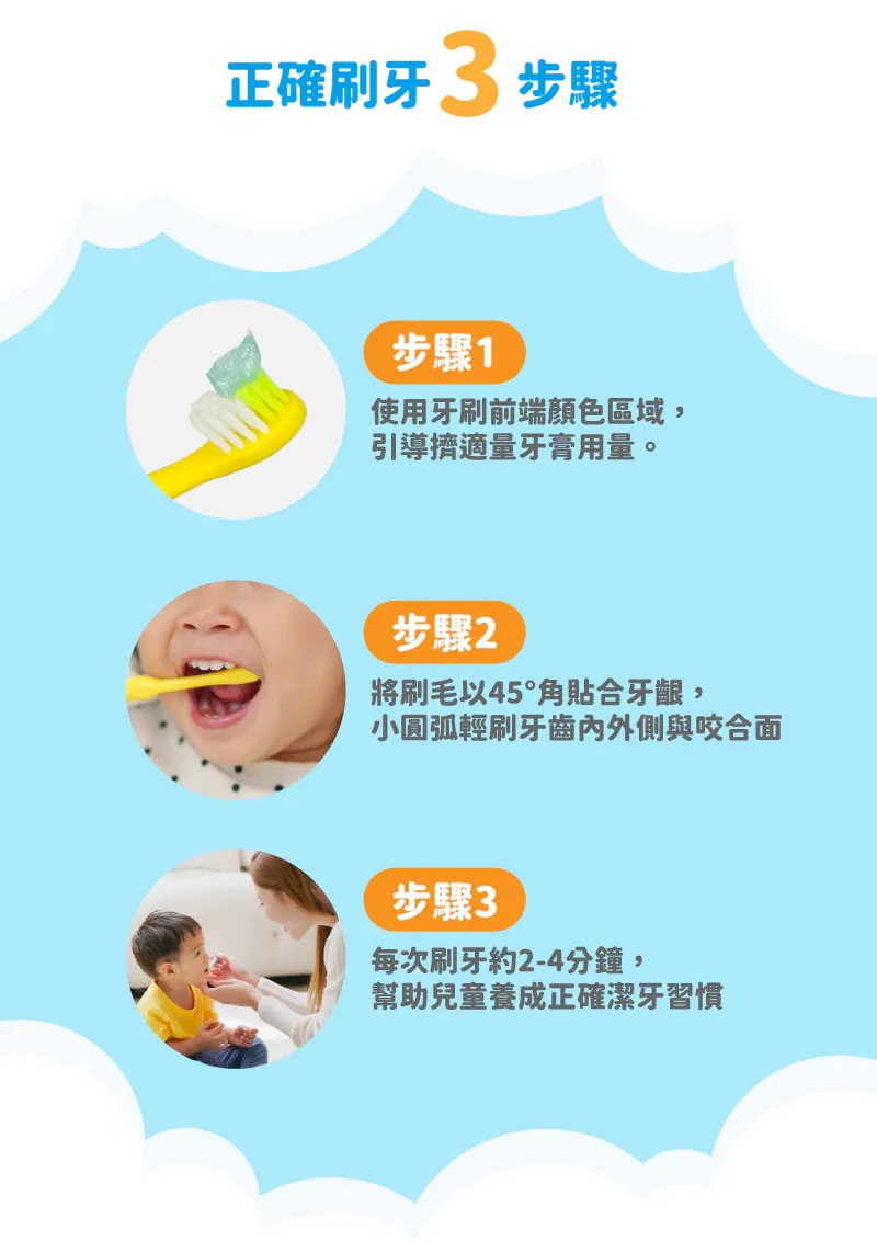 -建議適合0-4歲 -超柔軟刷毛,保護牙齦與乳齒 -人體工學防滑寬刷柄,寶寶更好握 -牙膏提示設計,輕鬆掌握正確用量 -一套兩支,雙色替換 -中國製造