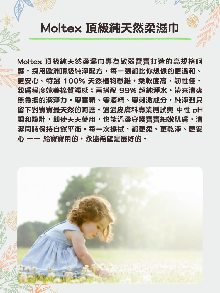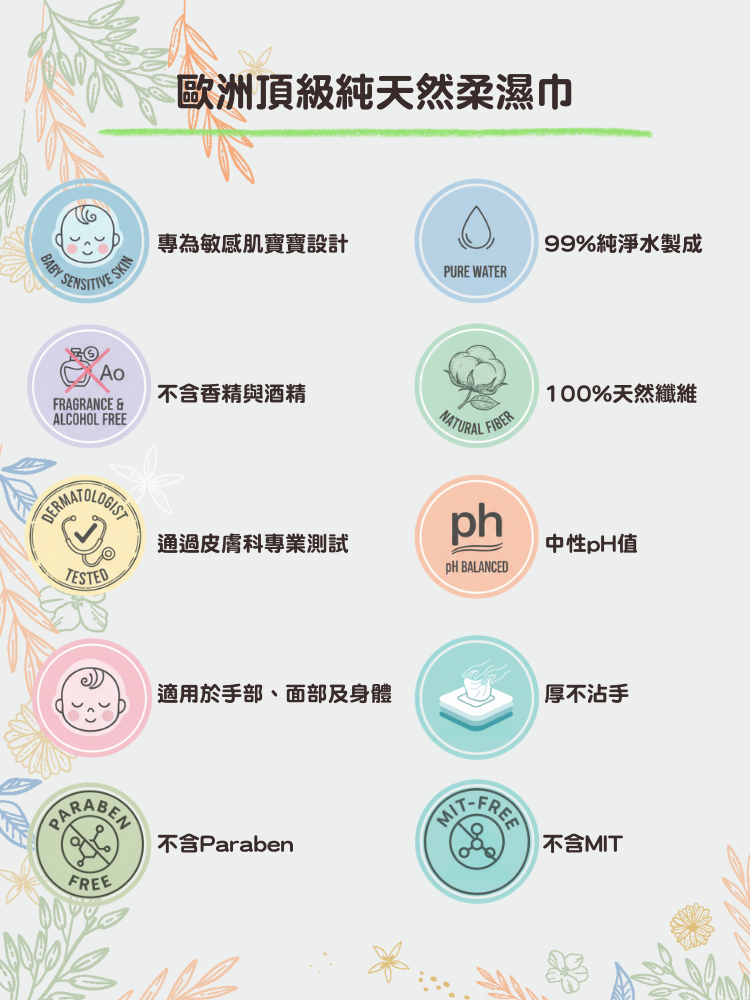 -專為敏感肌寶寶設計,溫和不刺激 -99%純淨水製成,安全安心 -100%天然纖維,柔軟親膚 -不含香精與酒精,呵護嬰兒細嫩肌膚 -中性pH值,有效保護皮膚屏障,減少刺激 -通過皮膚科專業測試,品質有保障 -輕巧包裝,方便外出攜帶