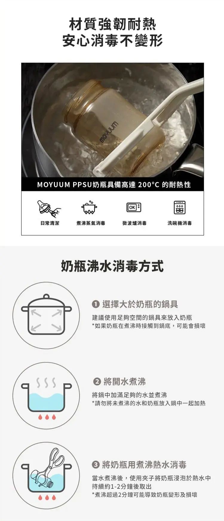 - Moyuum稱為韓國黃金奶瓶(K金)最優質及安全是您的最好選擇.選用PPSU 被公認為 最好的材質. -天然黃金色,不含任何人工色素 -仿母乳奶嘴,柔軟真實感 -寬型排氣閥,具紓氣結構令飲奶更順暢 -避免寶寶腸胃脹氣及腸絞痛 -寬口徑瓶口,清洗更方便,瓶底圓角設計, 無氣味, 不粘膩, 不吸油 -人體工學設計, 質地強韌, 耐用抗摔,是寶寶練習抓握奶瓶的首選 -符合歐盟EN14350:2020 -不含雙酚A -可高溫煮沸消毒至200度,可冷凍冷藏耐低溫 -符合FDA要求,具有卓越的耐熱性和耐久性的安全材料PPSU -韓國生產及設計 -建議:可選購’寬口奶瓶防漏學習吸管套裝’配合一起做出一款多功能的奶瓶及學習飲水瓶. 材質: - 寬口奶瓶: PPSU (耐熱性:0~200℃) - 防漲氣仿母乳奶嘴(第一階段 0-1m+): 食品級矽膠 (耐熱性:0~120℃) -奶瓶蓋及奶瓶圈: PP (耐熱性:0~100℃) -韓國製造​