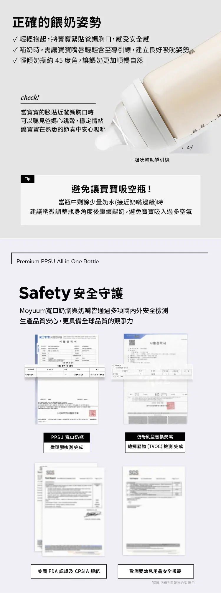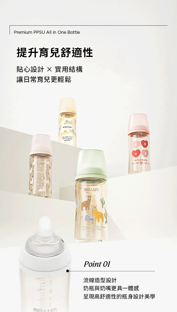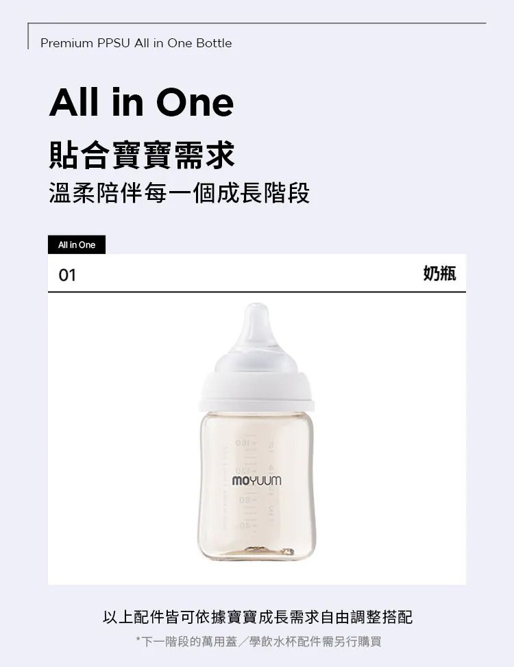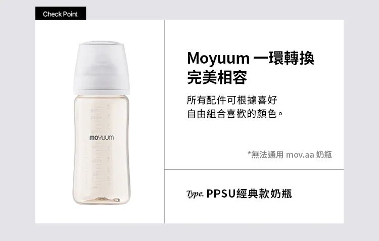 - Moyuum稱為韓國黃金奶瓶(K金)最優質及安全是您的最好選擇.選用PPSU 被公認為 最好的材質. -天然黃金色,不含任何人工色素 -仿母乳奶嘴,柔軟真實感 -寬型排氣閥,具紓氣結構令飲奶更順暢 -避免寶寶腸胃脹氣及腸絞痛 -寬口徑瓶口,清洗更方便,瓶底圓角設計, 無氣味, 不粘膩, 不吸油 -人體工學設計, 質地強韌, 耐用抗摔,是寶寶練習抓握奶瓶的首選 -符合歐盟EN14350:2020 -不含雙酚A -可高溫煮沸消毒至200度,可冷凍冷藏耐低溫 -符合FDA要求,具有卓越的耐熱性和耐久性的安全材料PPSU -韓國生產及設計 -建議:可選購’寬口奶瓶防漏學習吸管套裝’配合一起做出一款多功能的奶瓶及學習飲水瓶. 材質: - 寬口奶瓶: PPSU (耐熱性:0~200℃) - 防漲氣仿母乳奶嘴(第一階段 0-1m+): 食品級矽膠 (耐熱性:0~120℃) -奶瓶蓋及奶瓶圈: PP (耐熱性:0~100℃) -韓國製造​