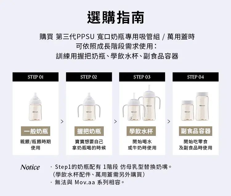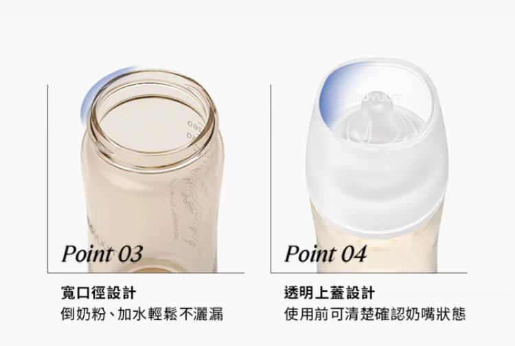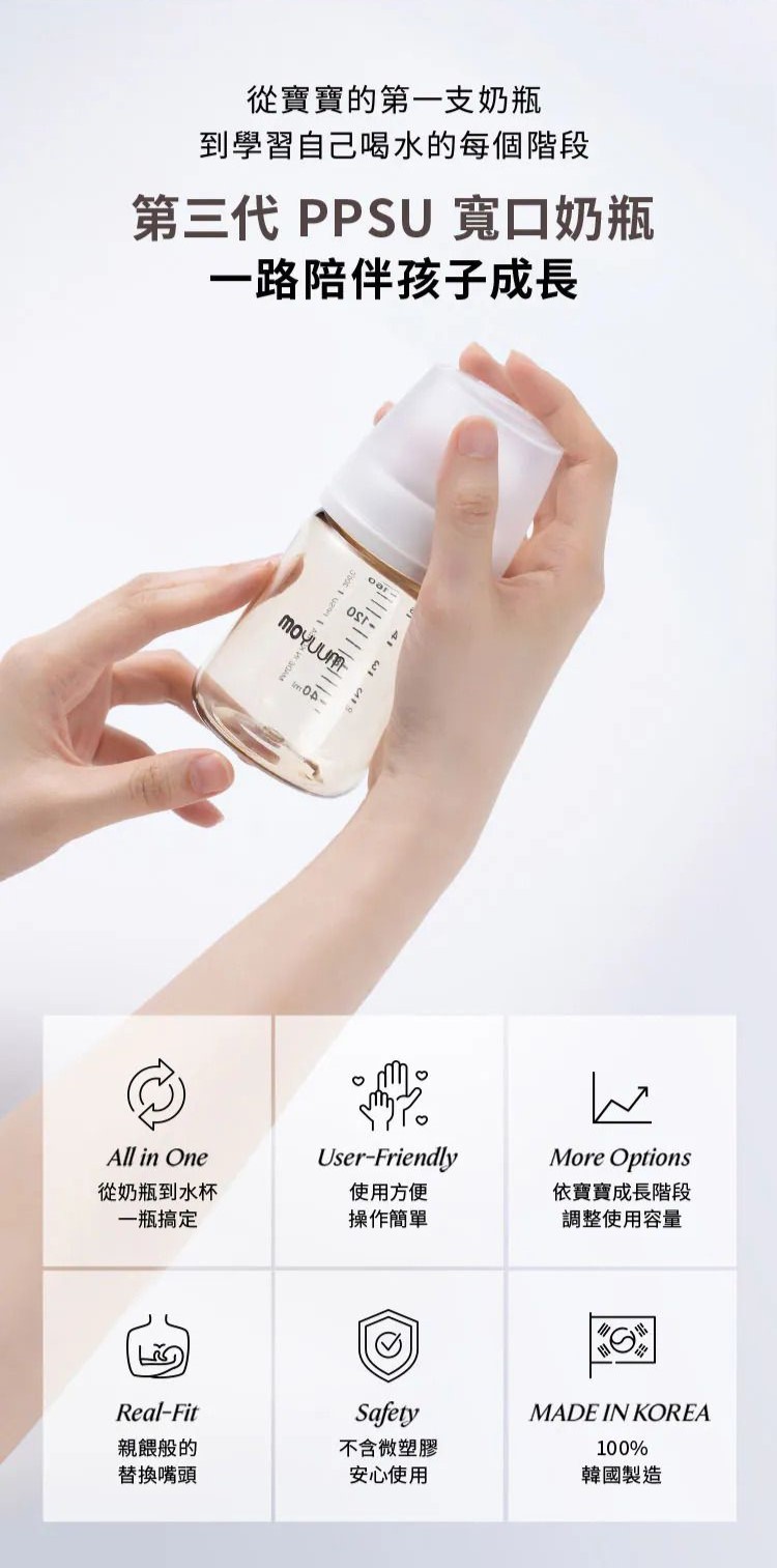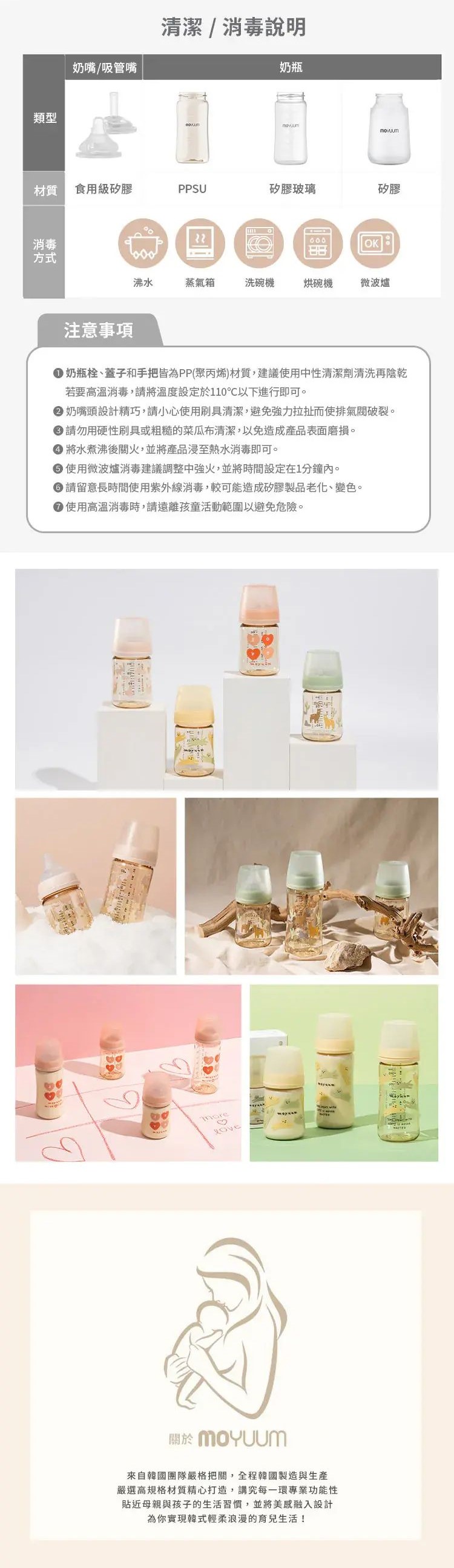 - Moyuum稱為韓國黃金奶瓶(K金)最優質及安全是您的最好選擇.選用PPSU 被公認為 最好的材質. -天然黃金色,不含任何人工色素 -仿母乳奶嘴,柔軟真實感 -寬型排氣閥,具紓氣結構令飲奶更順暢 -避免寶寶腸胃脹氣及腸絞痛 -寬口徑瓶口,清洗更方便,瓶底圓角設計, 無氣味, 不粘膩, 不吸油 -人體工學設計, 質地強韌, 耐用抗摔,是寶寶練習抓握奶瓶的首選 -符合歐盟EN14350:2020 -不含雙酚A -可高溫煮沸消毒至200度,可冷凍冷藏耐低溫 -符合FDA要求,具有卓越的耐熱性和耐久性的安全材料PPSU -韓國生產及設計 -建議:可選購’寬口奶瓶防漏學習吸管套裝’配合一起做出一款多功能的奶瓶及學習飲水瓶. 材質: - 寬口奶瓶: PPSU (耐熱性:0~200℃) - 防漲氣仿母乳奶嘴(第二階段3m+): 食品級矽膠 (耐熱性:0~120℃) -奶瓶蓋及奶瓶圈: PP (耐熱性:0~100℃) -韓國製造​