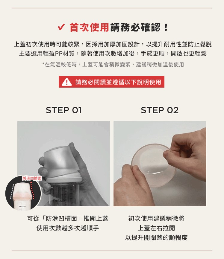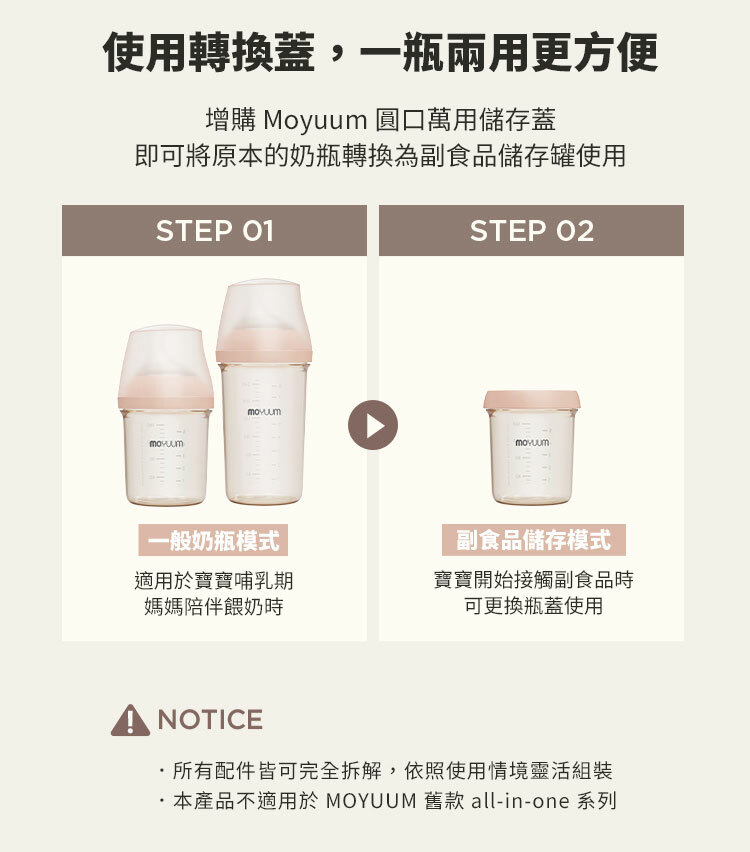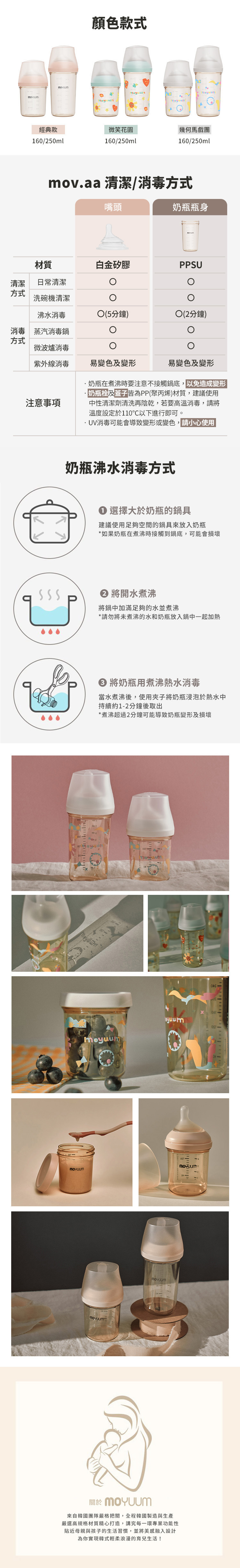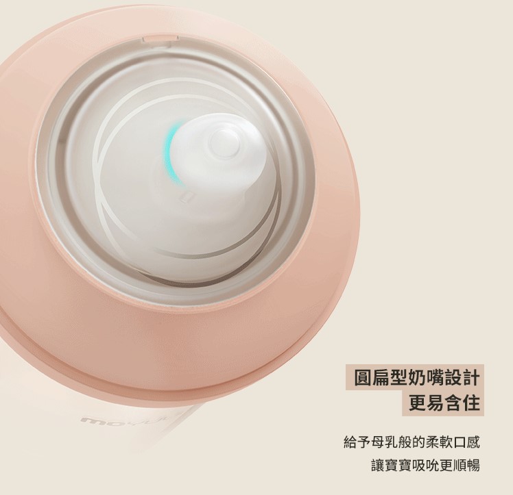 -由韓國著名插畫家Ga-Ae設計 -Moyuum稱為韓國黃金奶瓶(K金) -煮沸消毒至200度,可冷凍冷藏耐低溫 -偏心圓口設計,專為亞洲寶寶口腔設計,讓寶寶更容易吸吮 -仿母乳奶嘴,柔軟真實感 -寬型排氣閥,具紓氣結構令飲奶更順暢 -寬口徑瓶口,清洗更方便 -透明平底設計,輕鬆掌握喝奶狀況 -質地強韌, 耐用抗摔 -奶瓶及奶嘴適用於微波爐、蒸汽、紫外線消毒機、洗碗烘乾機、熱水進行消毒 -符合歐盟新標準EN 14350:2020 -符合美國FDA食品級標準材質及CPSIA認證 材質: - 圓口奶瓶: PPSU (耐熱性:0~200℃) - mov.aa偏心防漲氣仿母乳奶嘴(第二階段3m+): 食品級矽膠 (耐熱性:0~120℃) - 奶瓶蓋及奶瓶圈: PP (耐熱性:0~100℃) -韓國製造​