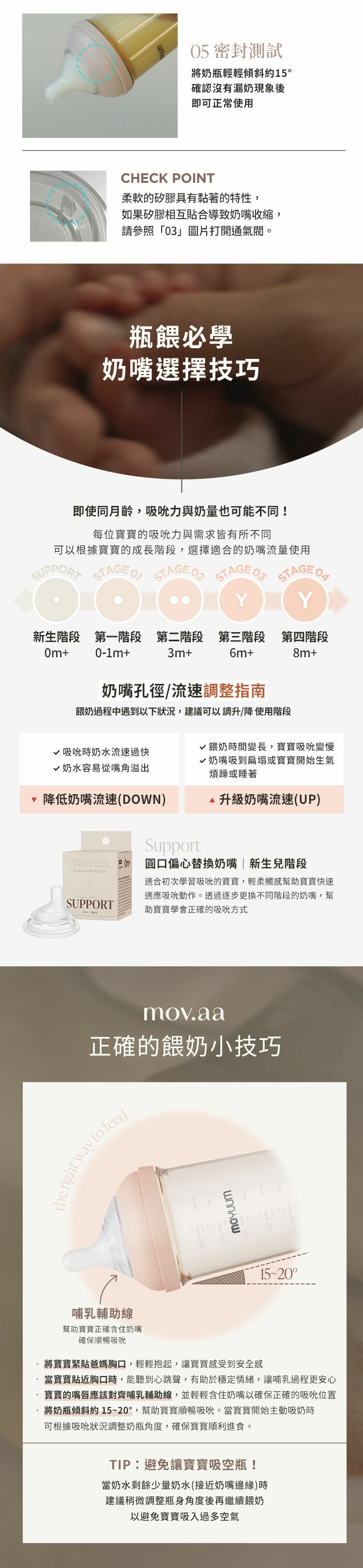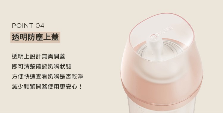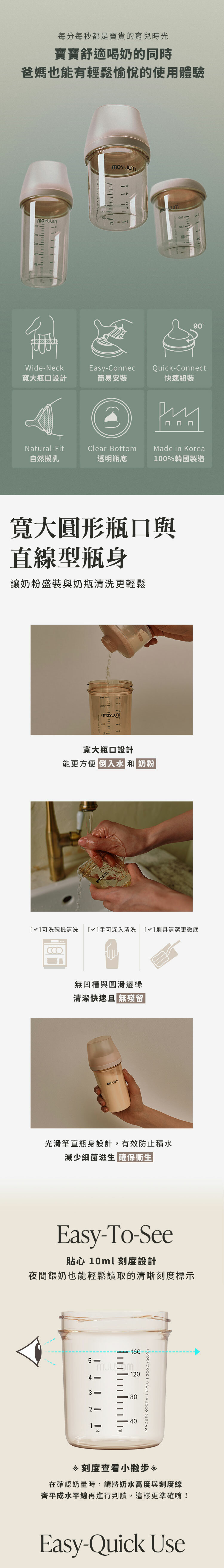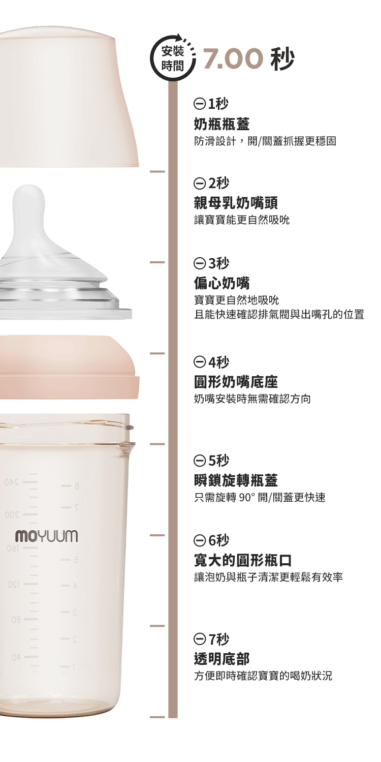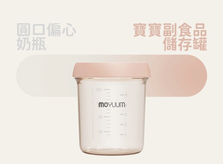 -由韓國著名插畫家Ga-Ae設計 -Moyuum稱為韓國黃金奶瓶(K金) -煮沸消毒至200度,可冷凍冷藏耐低溫 -偏心圓口設計,專為亞洲寶寶口腔設計,讓寶寶更容易吸吮 -仿母乳奶嘴,柔軟真實感 -寬型排氣閥,具紓氣結構令飲奶更順暢 -寬口徑瓶口,清洗更方便 -透明平底設計,輕鬆掌握喝奶狀況 -質地強韌, 耐用抗摔 -奶瓶及奶嘴適用於微波爐、蒸汽、紫外線消毒機、洗碗烘乾機、熱水進行消毒 -符合歐盟新標準EN 14350:2020 -符合美國FDA食品級標準材質及CPSIA認證 材質: - 圓口奶瓶: PPSU (耐熱性:0~200℃) - mov.aa偏心防漲氣仿母乳奶嘴(第二階段3m+): 食品級矽膠 (耐熱性:0~120℃) - 奶瓶蓋及奶瓶圈: PP (耐熱性:0~100℃) -韓國製造​