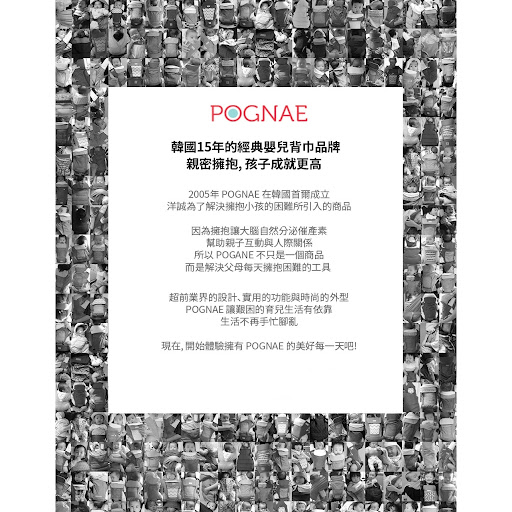 POGNAE 韓國NO.1 國民揹帶是媽媽的不二之選,Pognae成立於2005年,是韓國的嬰兒揹帶品牌,專門從事製造和銷售嬰兒背帶和其他配件。(包括計劃、開發、設計和生產在內的所有過程都通過嚴格的質量管理,100%韓國製造。) POGNAE 的設計靈感來自寶寶在媽媽溫暖的懷抱裡休息的情景。 POGNAE 品牌名來自”溫暖”的韓國發音,就表達柔和溫暖的品牌形象。POGNAE 最具代表性的商品,腰凳能幫助媽媽減輕抱寶寶時脊椎和髋骨承受的壓力,安全又輕鬆地抱住寶寶。上市以來,在韓國NAVER搜索引擎5年連續上腰凳排名第一,韓國媽咪圈裡被稱之為”國民腰凳揹帶”,成為媽媽的不二選擇。POGNAE 腰凳以優秀質量和認知度廣受消費者歡迎,且韓國腰凳品牌中獲得歐洲SGS認證和CE認證。 Max 萬能四合一揹帶 -一體式多功能的揹帶 -方便輕盈,靜音揹帶設計 -增加安全感覺 -舒適的M及C position -韓國製造 *一年原廠保用(請保留收據) *附送咬巾及前置咬巾 產品資料: -適合年齡: 1至36個月 -承載重量: 3.5KG-20KG -坐墊淨重:378g -揹帶淨重:635g -坐墊揹帶淨重:760g -腰圍限度: 不能超過43英吋 -STEP ONE背帶面料: 棉,網布 -初生嬰兒揹帶/腰凳背帶面料: 表面-機能防污布,裡布-純棉 -腰帶物料: 聚酯纖維 -坐墊物料: 海綿,防滑矽膠,EPP坐墊 -抗水, 抗污功能 - STEP ONE/初生嬰兒揹帶:請勿使用於年齡小於1個月的寶寶. - 雙肩腰凳揹帶:請勿使用於年齡小於3個月的寶寶 (3個月以上且可以頸部有力的寶寶方可使用).